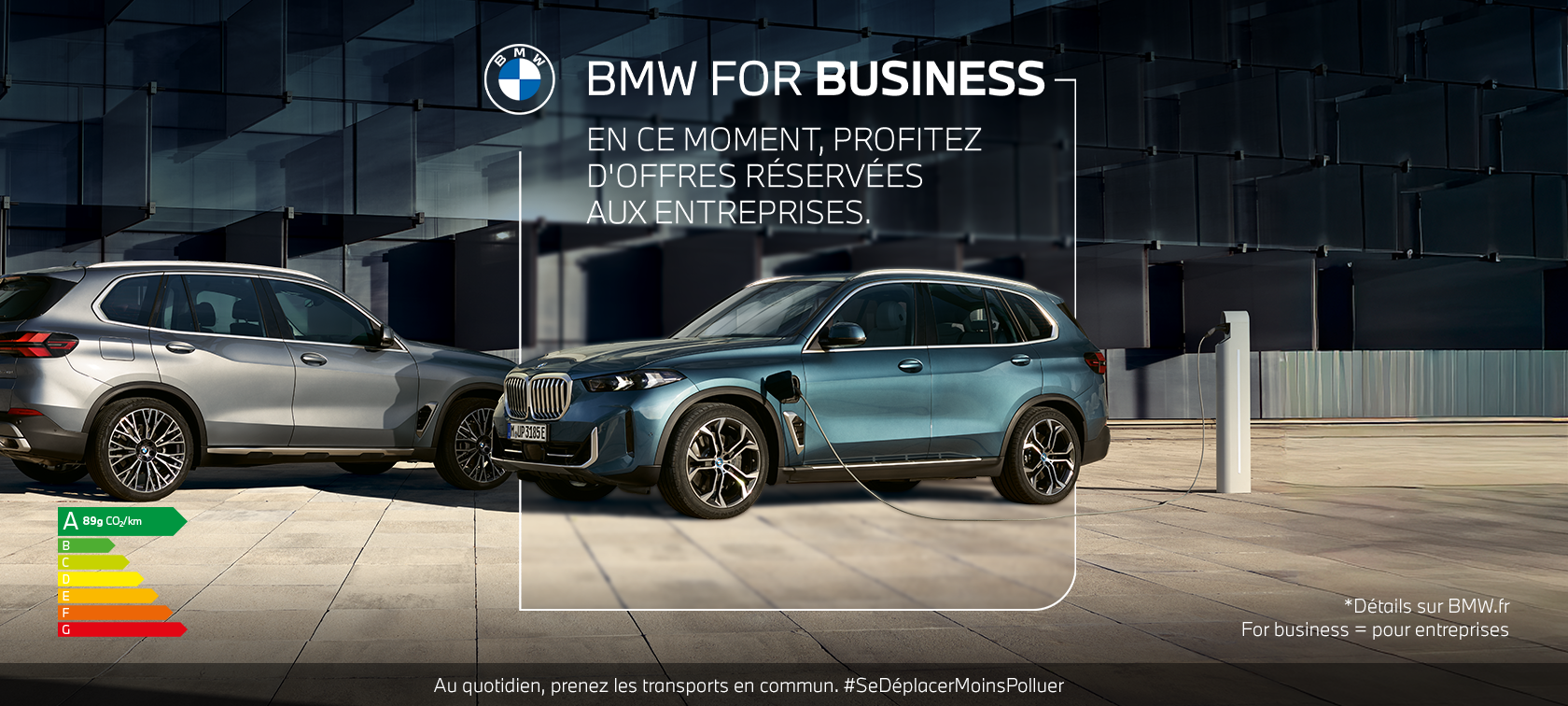 (2) BMW iX3 50 xDrive M Sport 469 ch BVA. 48 loyers linéaires : 789,77 €/mois hors coûts d’immatriculation. Location Longue Durée sur 48 mois et pour 40000 km incluant l’Entretien, l’Assistance 24h/24 et la Garantie Perte Financière. Tarif sous réserve des modifications du tarif constructeur en vigueur, assurances ou variation des taux financiers et taxes. Montants TTC dont TVA 20 %. Offre réservée aux professionnels pour toute commande d’une BMW iX3 50 xDrive M Sport 469 ch BVA dans les concessions participantes avant le 31/03/2026 et sous réserve d’acceptation de votre dossier par Alphabet France Fleet Management SAS au capital de 6 295 380, 25 € - 5, rue des Hérons à Montigny-Le-Bretonneux, 78182 Saint-Quentin-en-Yvelines Cedex – RCS Versailles 338 708 076 – N° TVA Intracommunautaire FR 61 338 708 076 – N°ORIAS : 13009206 – Téléphone : 01.30.47.10.66. Prestation Entretien & Assistance souscrite auprès d’Alphabet. La Garantie Perte Financière est accordée selon les conditions prévues au contrat n°7.610.101 souscrit auprès de MMA IARD Assurances Mutuelles, société d’assurance mutuelle à cotisations fixes, siège social : 14 bd Marie et Alexandre Oyon, 72030 Le Mans Cedex 9, 775 652 126 RCS Le Mans, et MMA IARD, SA au capital de 537 052 368 €, siège social : 14 bd Marie et Alexandre Oyon, 72030 Le Mans Cedex 9, 440 048 882 RCS Le Mans, sociétés appartenant au groupe COVEA et régies par le Code des assurances. MMA et Alphabet sont soumis au contrôle de l’Autorité de Contrôle Prudentiel et de Résolution- 4 Place de Budapest CS 92459 75436 Paris Cedex 09. Consommation électrique (WLTP) kWh/100km : 15,1 – 17,9 ; Émissions de CO2 (WLTP combinées) : 0 g/km ; Autonomie électrique (WLTP) en km : 679 – 805 km. Depuis le 01/09/2018, les véhicules légers neufs sont réceptionnés en Europe sur la base de la procédure d’essai harmonisée pour les véhicules légers (WLTP), procédure d’essai permettant de mesurer la consommation de carburant et les émissions de CO₂, plus réaliste que la procédure NEDC précédemment utilisée