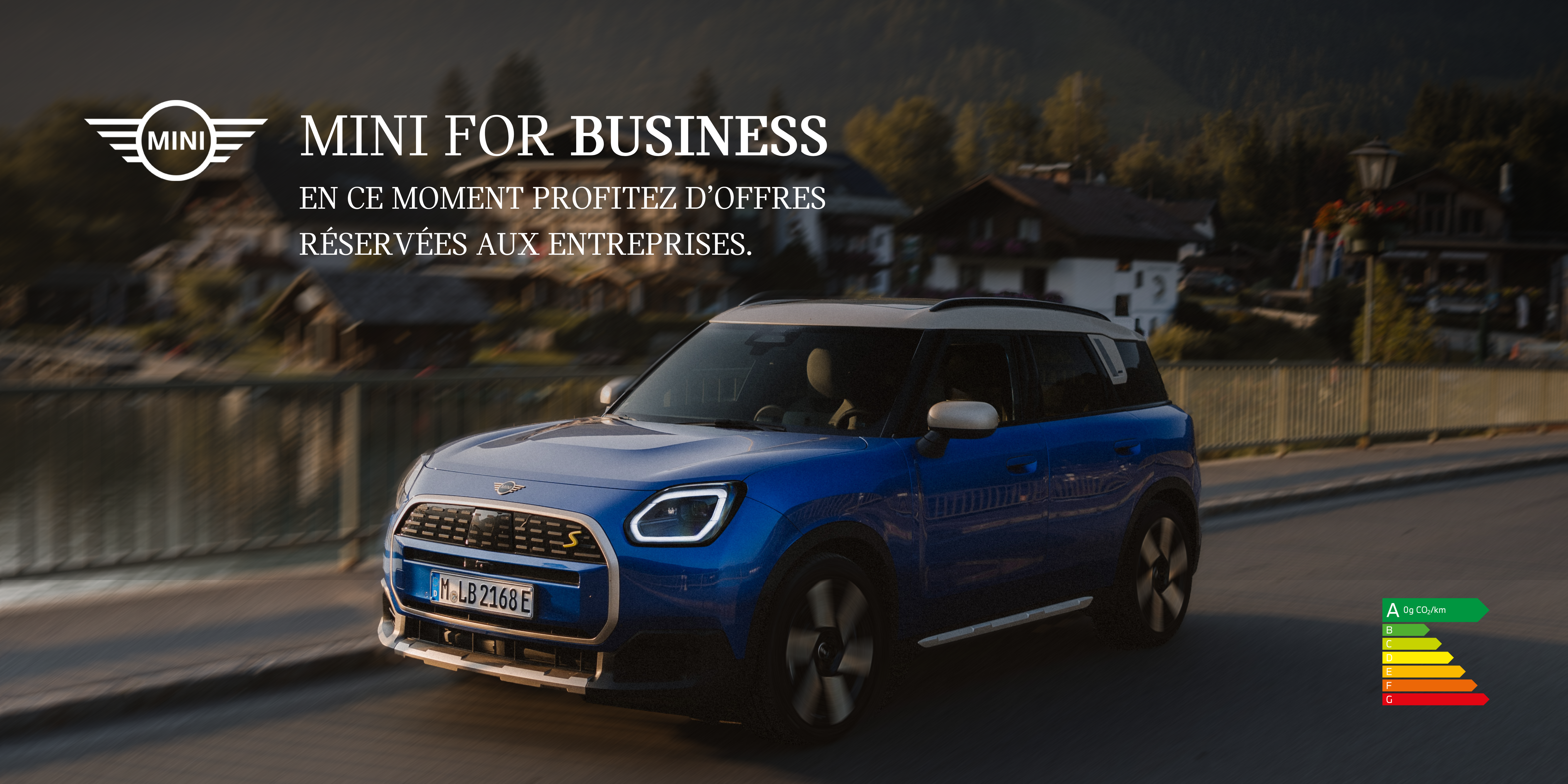 MINI Countryman E Classic XS 204 ch BVA 5 portes. 48 loyers linéaires : 438,41 €/mois hors coûts d’immatriculation. Location Longue Durée sur 48 mois et pour 40000 km incluant l'Entretien, l'Assistance 24h/24 et la Garantie Perte Financière. Tarif sous réserve des modifications du tarif constructeur en vigueur, assurances ou variation des taux financiers et taxes. Montants TTC dont TVA 20 %. Offre réservée aux professionnels pour toute commande d’une MINI Countryman E Classic XS 204 ch BVA 5 portes dans les agences participantes avant le 31/12/2025 et sous réserve d'acceptation de votre dossier par Alphabet France Fleet Management SAS au capital de 6 295 380, 25 € - 5, rue des Hérons à Montigny-Le-Bretonneux, 78182 Saint-Quentin-en-Yvelines Cedex - RCS Versailles 338 708 076 - N° TVA Intracommunautaire FR 61 338 708 076 - N°ORIAS : 13009206 - Téléphone : 01.30.47.10.66. Prestation Entretien & Assistance souscrite auprès d’Alphabet. La Garantie Perte Financière est accordée selon les conditions prévues au contrat n°7.610.101 souscrit auprès de MMA IARD Assurances Mutuelles, société d’assurance mutuelle à cotisations fixes, siège social : 14 bd Marie et Alexandre Oyon, 72030 Le Mans Cedex 9, 775 652 126 RCS Le Mans, et MMA IARD, SA au capital de 537 052 368 €, siège social : 14 bd Marie et Alexandre Oyon, 72030 Le Mans Cedex 9, 440 048 882 RCS Le Mans, sociétés appartenant au groupe COVEA et régies par le Code des assurances. MMA et Alphabet sont soumis au contrôle de l’Autorité de Contrôle Prudentiel et de Résolution- 4 Place de Budapest CS 92459 75436 Paris Cedex 09. Le véhicule présenté comporte des équipements en option, le loyer ainsi que le détail des caractéristiques techniques du véhicule sont disponibles auprès d'Alphabet. Consommation d'énergie électrique : 15,7 – 17,4 kWh/ 100 km. CO2 combinée : 0 g/km. Autonomie électrique : 423 - 462 km - Norme WLTP. Depuis le 01/09/2018, les véhicules légers neufs sont réceptionnés en Europe sur la base de la procédure d’essai harmonisée pour les véhicules légers (WLTP), procédure d’essai permettant de mesurer la consommation de carburant et les émissions de CO₂, plus réaliste que la procédure NEDC précédemment utilisée.
